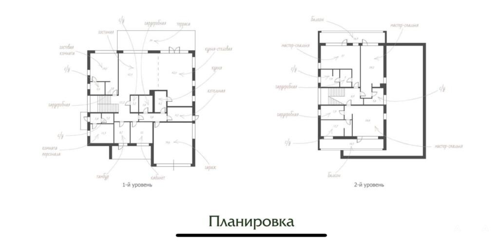 1 этаж: коридор, холл, гардеробная, рабочая кухня, гостевой санузел, кабинет, спальня со своим санузлом, кухня-столовая-гостиная с камином, гараж на 2 машины, отдельный вход в блок для персонала.